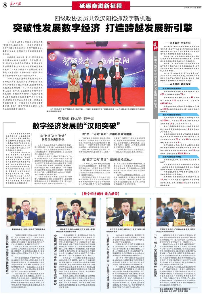 3月30日,汉阳区四级政协委员共谋“智领先机,数创汉阳——突破性发展数字经济”专题协商活动举行,汉阳广撒英雄帖,集聚多方智慧,共同助力汉阳突破性发展数字经济。